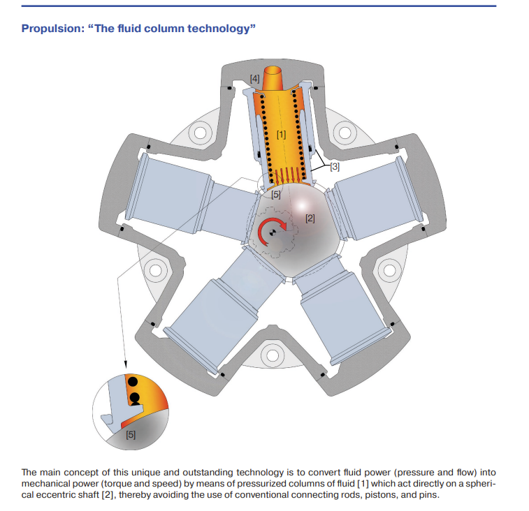 Fraser: Calzoni is an Italian manufacturer of radial piston motors. This type of motor can be very powerful, meaning it takes a high amount of flow and turns at a lower RPM. Lifco is very familiar with it because it was part of Denison Hydraulics, and then was included in the purchase by Parker. However, just in the past year it has become an independent company. These motors can become very large (the largest, the MRTA series, is 5000 lbs). The radial piston motor is very similar to a radial piston engine, like ones you see in aircraft.